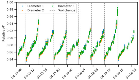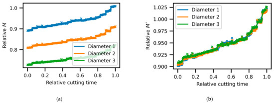 Figure 4a shows typical data for the spindle torque over the lifecycle of one tool, which was used to cut 15 workpieces. Each datapoint corresponds to 1 s of data from the cuts with a cutting depth of 4.5 mm. The torque Mc is clearly distinguishable for each of the three cuts at different workpiece diameters, but Figure 4b shows that the normalized spindle torque M’ falls onto the same curve for all three diameters. This universal behavior confirms the correctness of the data analysis.