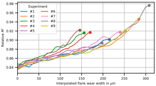 Furthermore, the absolute value of tool condition is investigated as well. Tool wear was measured at the insert radius with the image evaluation procedure [25], yielding the average flank wear width. These values thus represent the ground truth of the wear at the end of each tool’s lifetime and are represented as circles in Figure 7. Assuming that the wear develops linearly with usage time, the smoothed normalized spindle torque can then be plotted as a function of the interpolated wear (lines in Figure 7). Experiments #3, #4, and #6 reach their end-of-life rather early with measured flank wear widths in the range 120 µm to 170 µm. However, they show rather high normalized spindle torques, such as experiments #7 and #9, which reach a flank wear width of about 240 µm. The remaining experiments #1, #2, #5, #7, #8, and #9 show varying degrees of tool condition, ranging from 200 µm to 310 µm. However, there seems to be a good correlation between measured normalized spindle torques and interpolated flank wear width, as the trend curves of these experiments align well with each other.