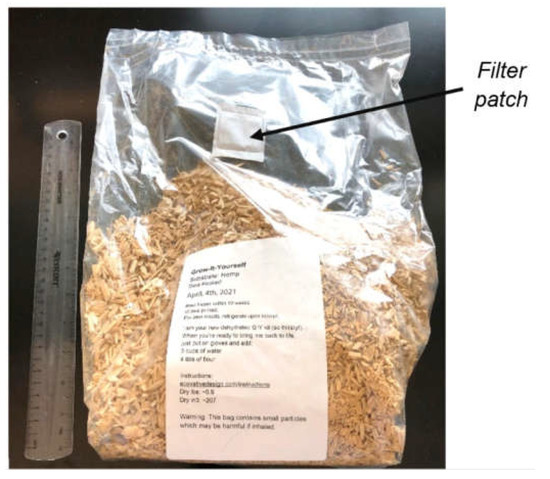 The biomass–fungi material (its commercial name is “Grow-It-Yourself”) was procured from Ecovative Design, NY. Before the biomass–fungi material was shipped to the authors, it underwent three steps in the factory. First, the biomass material was pasteurized to eliminate harmful microorganisms. Second, the pasteurized biomass material was inoculated with the fungi (belonging to the Basidiomycete group). Thereafter, the fungi colonized the biomass material. Lastly, this biomass–fungi material was dehydrated before being packed. This as-received material was in polypropylene filter patch bags with a filter (1.5 inch square filter with a pore size of 0.2 µm) as part of the bag to facilitate fungi growth. Each bag contained 400 g of the material, as shown in Figure 1. This as-received material was converted into a biomass–fungi mixture that can be 3D-printed by using the material extrusion process. It is noted that the fungi used in this study were no longer alive in the final products, because the last stage of the 3D printing based manufacturing method for biomass–fungi material is drying; during drying, all fungi are killed. Additional details about this material and 3D printing process can be found in a prior publication [24].