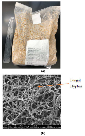 Sustainable materials such as biomass–fungi composite materials can help reduce the negative impacts of the construction and packaging industries [4,5,6,7]. In biomass–fungi composite materials, the biomass derived from agricultural waste (such as rice straw and corn stover) acts as the substrate and a nutrition source for the fungi. The fungi grow as a network of fine white filaments (hyphae), also known as the mycelium. This mycelium binds the biomass together. The mechanical properties of the mycelium are similar to materials such as wood and cork [8]. This is understandable, since fungi are a natural source of structural polymers such as chitin, which are present in the mycelium [9,10].