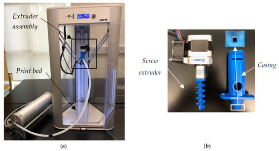 The printer used in this study was a Delta WASP 2040 (Figure 4a) material extrusion 3D printer, which was purchased from Spectrum Scientific (Philadelphia, PA, USA). Material extrusion is defined as a “process in which material is selectively dispensed through a nozzle or orifice” [28]. This printer had a cylindroconical build volume, the cylindrical section of which had a diameter of 20 cm and a height of 40 cm. The conical section was situated on top of the cylindrical section with a base diameter of 20 cm and a height of 30 cm. The printer had a material storage container and an extruder assembly. The mixture used for printing was stored in the material storage container before extrusion and pushed to the extruder assembly using a pneumatically operated piston. The extruder assembly comprised a screw extruder and a casing (Figure 4b). The casing surrounding the screw extruder had a 6 mm nozzle with a square cross-section. Ultimaker Cura software (15.04.2) was used to generate the G-code file used to print the samples.