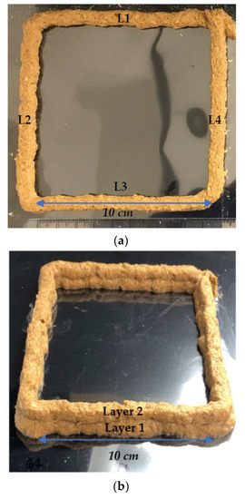 In this study, the print quality was assessed using two parameters: extrudability and shape stability. Extrudability is defined as the capacity of the mixture to pass through the nozzle of the 3D printer [29], which is characterized using two criteria: first, whether the material can be extruded without visible tearing in the extruded filament; second, whether the extruded filament exhibits dimensional consistency. Dimensional consistency was measured by the variation in filament width in the printed sample. A sample was designated to have good dimensional consistency if no more than ±5% variation (from the mean) was observed through the length of the filament [30]. To measure extrudability, two square samples (S1 and S2) were printed. Each sample consisted of four filaments (L1 through L4) with a length of 10 cm each (see Figure 5). Five measurements (width and height) were taken uniformly over the length of each filament.