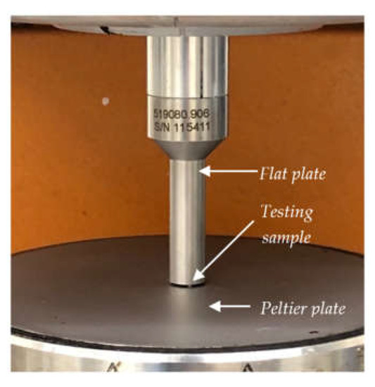 The rheological characterization of the biomass–fungi mixtures was conducted using a TA Instruments DHR-2 rheometer. The gap between the base Peltier plate and the flat plate (8 mm in diameter) was 500 µm (see Figure 6). The shear rate was changed from 0.01 to 2000 s-1. The shear thinning behavior of the mixtures was characterized by plotting a viscosity vs. shear rate curve. The shear elastic modulus (G′), shear loss modulus (G″), and loss tangent (i.e., tan(δ)) were also measured, where δ is the phase angle of the material. The loss tangent (tan(δ)) is the ratio of the shear loss modulus (G″) to the shear elastic modulus (G′), as shown in Equation (1). This ratio determines the liquid-like or solid-like nature of a mixture [25,31]. Mixtures behaving in the same manner as solids would fail to extrude through the printer nozzle. Alternately, mixtures exhibiting dominant liquid characteristics would not be printable for multiple layers, as the extruded layers would collapse as soon as the second layer was printed on top of them.
