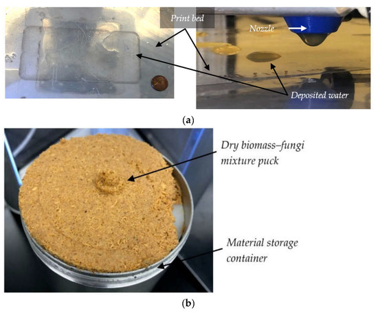Mixture A (without any psyllium husk powder) was not extrudable. As shown in Figure 7a, the piston in the material container pushed the water out of the biomass–fungi mixture. This water was deposited on the print bed. The non-printable biomass–fungi mixture was left as a dry puck in the material storage container, as shown in Figure 7b.