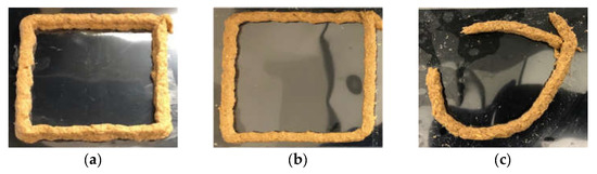 Printed samples using three mixtures with different levels of psyllium husk powder: (a) mixture B (wp/vw = 1:40); (b) mixture C (wp/vw = 2:40); (c) mixture D (wp/vw = 3:40).