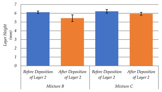 Figure 9 shows height data for layer 1 after depositing layer 2 for samples printed using mixtures B and C. The error bars indicate the standard deviation of the respective samples in Figure 9. The reductions in height for layer 1 were 11% for the samples printed using mixture B and 5% for the samples printed using mixture C. Samples printed using mixture C showed much better shape stability than samples printed using mixture B.