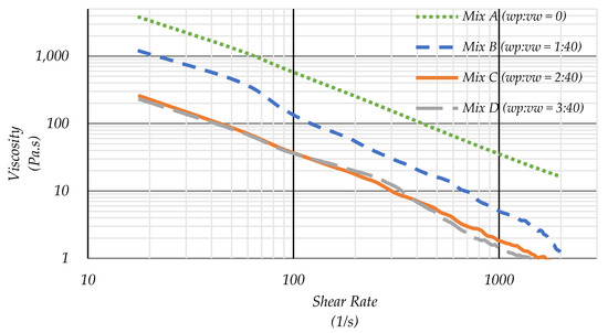 - Mixture B (wp/vw = 1:40) showed higher viscosity than mixture C (wp/vw = 2:40). Both mixtures showed shear thinning behavior.