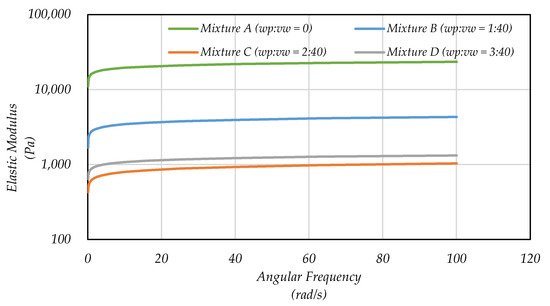 As the psyllium husk powder content was increased, the elastic modulus of the biomass–fungi mixtures was reduced for mixtures A, B, and C (see Figure 11). Further addition of psyllium husk powder resulted in a 37% average increase of G′ for mixture D as compared to Mixture C.