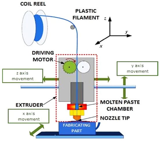 Among all other additive manufacturing techniques, fused deposition modelling (FDM) plays a dominant role in all kinds of industries from small-scale to large-scale due its low cost and its ease of operation, even by non-professionals [2]. FDM is a process in which a circular cross-sectional filament of predefined diameter is made to push into the hot end by means of a feeder with a defined speed, and melted material is exited from the nozzle attached to the hot end, which follows a defined path to construct a specimen layer-by-layer (Figure 1). The path and process parameters (printing patterns, infill density, infill angle, nozzle temperature, printing speed, etc.) can be given and controlled by a software called slicer using a 3D CAD model [3].