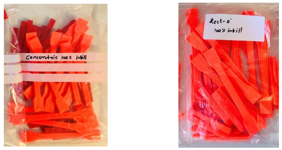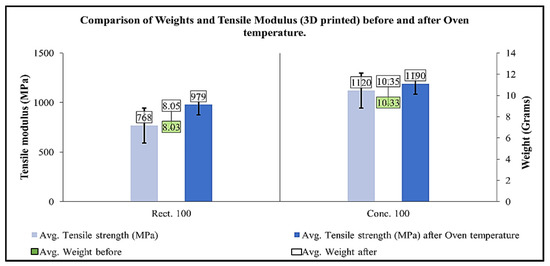 The result of a tensile test displays the tensile modulus and weight difference of the 3D-printed samples shown in Figure 13; there was, on general, a 0.2% reduction in weight of the specimens after the oven temperature process. Both patterns, concentric and rectilinear, exhibited an increase in tensile modulus.