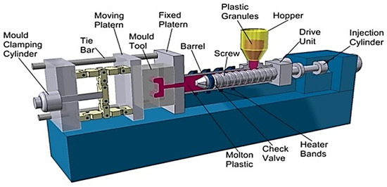 Injection molding process illustrated in Figure 8 is one of the most common process for manufacturing plastic parts in large volumes. In the injection molding process, the chopped filament PLA pellets [18] were used as the raw material. In this process, when the raw material was taken, the automatic Hooper and the required melting point temperature for the plastic material were given as the input to the machine. The proper mold temperature, mold cavity pressure, holding pressure, flow speed, and volume were properly uploaded, and then the PLA dog bone samples were manufactured [19].