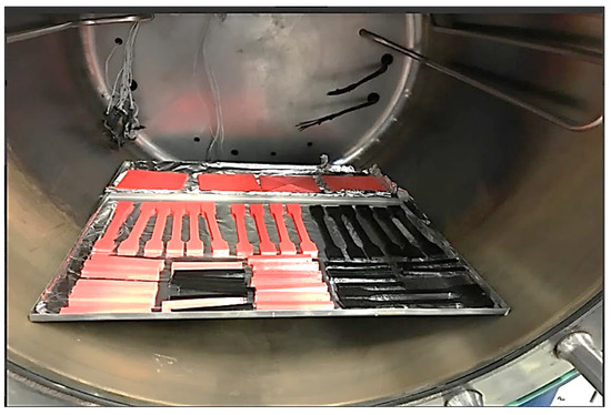The inner composition of the printed item, which can range from 0% to 100%, is referred to as infill. It plays an important role in determining the modulus and strength of the whole feature. Higher infill means the part is denser or more solid, allowing the part to process a better mechanical strength. So, 100% infill was chosen to print all the testing specimens. Infill patterns are also available in various shapes, including concentric and rectangular ones. A total of 100 samples for tensile, Charpy, and flexural testing were produced via 3D printing (according to Table 1). A nozzle of 0.4 mm was used for the 3D printer extruder. Around 60 samples were printed as shown in Figure 6, including dog bone and rectangular panels. After 3D printing, the test samples were exposed to autoclave temperature, autoclave pressure, and oven temperate.