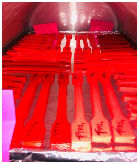 The 3D-printed samples of concentric and rectilinear pattern, both with 100% infill print specimens, were annealed at 60 °C temperature inside the oven, as shown in Figure 10 and Figure 11, with 0 bar pressure for 8 h.
