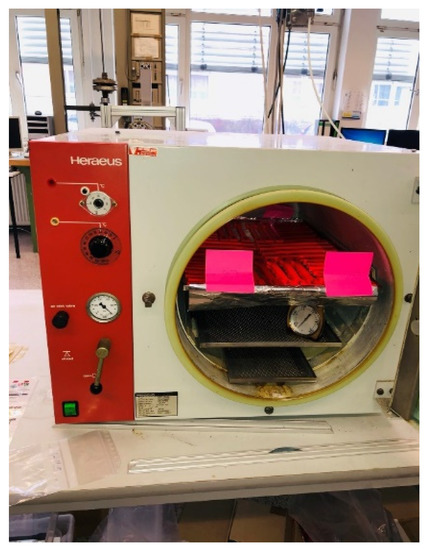 Therefore, it was decided to test the PLA of 3D-printed and injection-molded samples in autoclave. It is important to maintain the ambient temperature and pressure, which is easily possible in an autoclave. The post-treatment process aimed to improve the mechanical properties of PLA by placing the 3D-printed specimens and injection-molded specimens inside the autoclave chamber under the desired pressure and temperature for a prescribed duration of time.