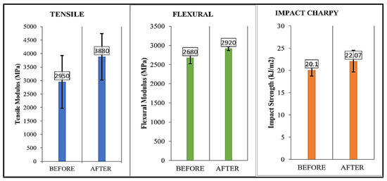 From the graph in Figure 12, it is clear that there is significant increase (almost 30%) in tensile modulus of injection-molded samples after the post-treatment in autoclave under temperature and pressure conditions. Additionally, there is an increase in flexural modulus and impact strength after post-treatment in the autoclave but comparatively less improvement than the tensile modulus.