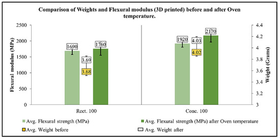Comparison between weights and flexural modulus of PLA 3D-printed samples before and after oven temperature treatment.