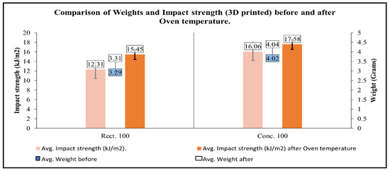The results of the impact test display the impact strength of the 3D-printed samples in Figure 15; there was, on general, a 0.2% reduction in the weight of the specimens after oven temperature treatment process. Both patterns shown an excellent increment in impact strength.
