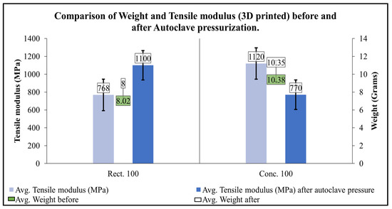 Showing comparison between weights and tensile modulus of PLA 3D-printed samples before and after autoclave pressurization.