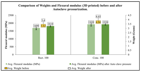 Showing comparison between weights and flexural modulus of PLA 3D-printed samples before and after autoclave pressurization.