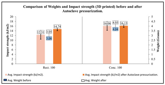 The results of impact test display both the properties of the impact strength and weight difference of the 3D-printed samples, as shown in Figure 18; there was, in general, a 0.2% increase in weight of the specimens after autoclave pressurization treatment process. The rectilinear pattern illustrated an increase by +10% in impact strength. The concentric pattern did not significantly improve.