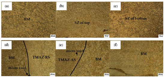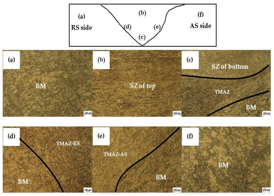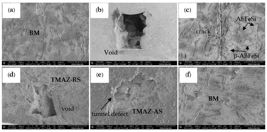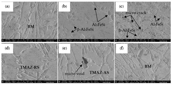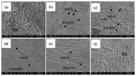 The characteristics of the Al5FeSi intermetallic compound evaluation by SEM (6000×) of the optimal welding conditions of D-optimal: (a,f) BM, (b,c) SZ, (e) TMAZ-AS, and (d) TMAZ-RS.