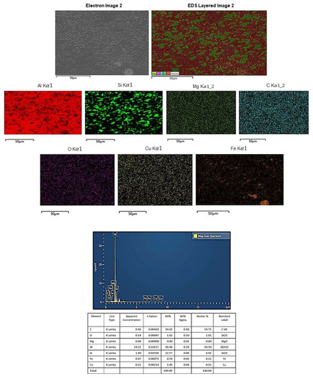 The concentration of the alloying elements in the SZ was evaluated by EDX-ray spectroscopy. The weld seam structure of the MOVaNSAS approach was checked for the elemental composition of the Al5FeSi phase of new crystallization and intermetallic compound formation. The Al5FeSi phase change in particle size and distribution of phase was influenced by the heat input and experimental parameters. The Al5FeSi phase formed from the Mg2Si phase because the Fe element separated the Mg2Si phase formation, as shown in Figure 15.