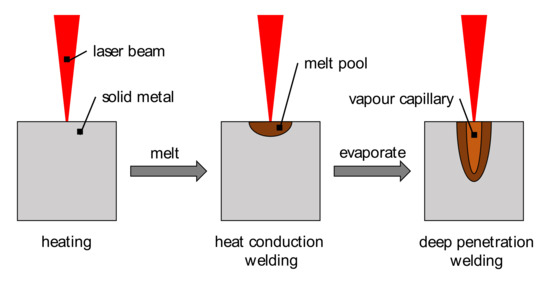 In heat conduction welding, the material is heated locally to a temperature above the melting point, whereby the energy coupling into the material takes place exclusively at the material surface. Due to reflection levels > 95% of copper in the infrared range, only a relatively small proportion of the energy is introduced into the material [19]. The energy transport from the surface into the material only takes place through heat conduction. By increasing the power density of the radiation, the transition from heat conduction welding to deep penetration welding can be realized (Figure 1).