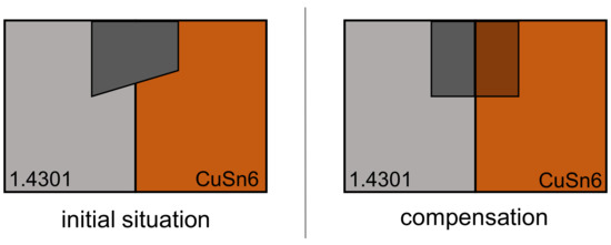 The temporal power modulation is adjusted by ±40 W for the bed on plate welds on CuSn6 to compensate for the change in path velocity. For the joining of the dissimilar material combination, the temporal power modulation was increased up to ±60 W to additionally compensate for the difference in the material properties between CuSn6 and 1.4301. This was the highest amplitude possible with the used laser beam source. To take into account statistical fluctuations in the process, all tests were carried out with a number of n = 3 in order to exclude outliers in the results.