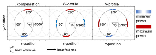 While the compensation of the difference in welding depth is investigated with the same frequency of the local and the temporal power modulation, the welding tests for the generation of the W-profile and the V-profile are carried out with a frequency of the temporal power modulation twice as high as the frequency of the spatial one. As a result, the minimum and maximum of the energy per unit length alternate every 90° on the track of the spatial power modulation.