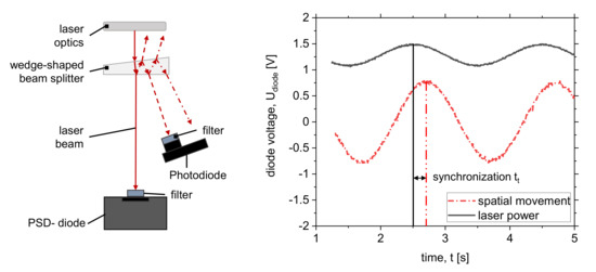 The setup allows synchronizing the laser power modulation with the spatial location of the laser beam on the surface. Therefore, a PSD diode (Hamamatsu C10443-03) and a photodiode (Thorlabs DET10A2) are used. These diodes allow capturing both the change in laser beam intensity (photodiode) as well as the location of the laser beam on a 12 × 12 mm2 diode (PSD-diode). Both signals are captured with an oscilloscope DSO-X 2002A. In the diagram (Figure 6, right), the phase difference of the temporal and the spatial modulation can be analyzed. The constant phase difference evoked by the technical equipment of the experimental setup can then be equalized by either increasing or reducing the phase of the temporal power modulation to match the movement of the laser scanner.