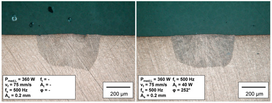 In this section, the most representative parameters with the most distinctive details are presented. First, the initial situation is shown compared to the approach for compensating the difference in weld depth. Figure 7, left, shows a weld with spatial power modulation only.