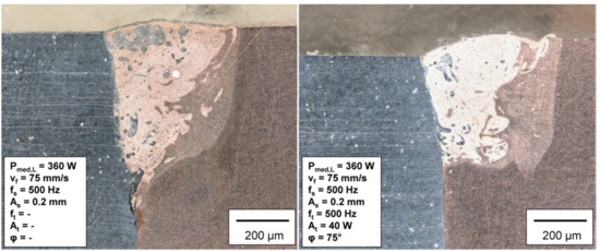 The slanted seam base is clearly visible. As in the state of the art mentioned, the tilting is pronounced on the side with the higher energy per unit length (lower path velocity). A tilting of this kind would, in the worst case, lead to the destruction of the component, especially on components with only thin substrate layers and an underlying sensitive layer. Therefore, precise control of the welding depth is necessary. This has been achieved in Figure 7, right, by superimposing local and temporal power modulation. The synchronized superimposition of the temporal power modulation with an amplitude of ±40 W visibly compensates for the tilting. The tilt could be reduced from 22.5% to 14%, measured with the welding depth on the right and left side. For the generation of a perfectly rectangular seam cross-section, a more precise parameter study and further optimizations of the process control strategies are necessary.