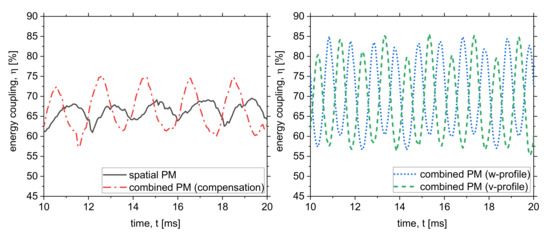 Figure 11, right, shows the temporal courses of the coupling degrees of the W- and the V-profile. As the graph of the compensation profile, these show a sinusoidal curve but with a temporal frequency of 1000 Hz. The frequency of the temporal modulation is twice as large as the frequency of the spatial modulation. The amplitude of the energy coupling increases further for both profiles due to the higher temporal power modulation of ±60 W. The respective course of the degree of coupling is smoothed and the welding process further stabilized. The two curves are shifted relative to each other by approx. π (90°) on the time scale, which corresponds to the phase shift of the power maxima of the profiles relative to each other. The superposition of the local modulation and the temporal modulation with double the frequency can be recognized by the periodically changing magnitude of the maxima and minima of the coupling degree of the W-profile and the V-profile.