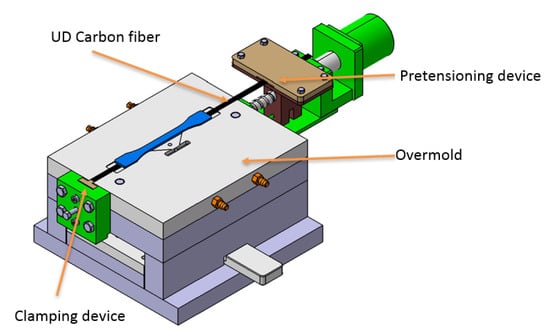 Carbon fiber was cut to 350 mm to allow sufficient passage for pretension clamping for unidirectional reinforcement. Both short and unidirectional fibers had been surface treated with liquid nitrogen for 10 min to improve fibers and matrix bonding properties. Surface treatment of carbon fiber with liquid nitrogen had been proven to produce high interfacial shear strength (IFSS) of carbon fiber-reinforced polypropylene [27]. The unidirectional fiber was mounted on a mold equipped with a pretension device, as shown in Figure 3. The mold was mounted on a 70-ton clamping capacity Meiki injection molding machine. One end of the fiber was clamped on the clamp, while the other end was pulled with varying tension: 8%, 21%, and 33% of the ultimate strength of fiber, respectively [23,28]. Pretension is obtained by static loading, since the cross-section area of the carbon fiber bundle is 7 mm × 7 μm = 0.049 mm2; then, the load applied to the fiber was 20 N, 50 N, and 80 N, respectively.