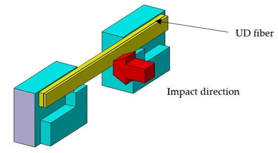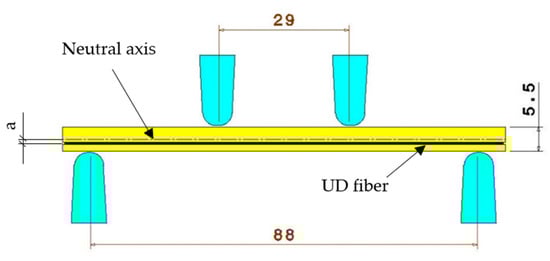 Test configuration was set up according to ISO 178. The test was carried out with a crosshead rate of 2 mm/min [29]. Due to the fact that the thickness of the specimen was 5.5 mm, the standard length of the specimen was 100 mm, and the span length was 88 mm [30]. Thickness was designed to be higher than that of standard specimens to allow for significant surface strains at relatively small deflections [31]. Under bending, the unidirectional fiber was positioned close to the bottom side with an offset “a” from the neutral axis because of reduced compressive modulus, as shown in Figure 4. When the unidirectional reinforcement is precisely placed on the neutral axis, the maximum compressive strain (top surface) is greater than the maximum tensile strain (bottom surface); as a result, the maximum tensile stress is lower than the maximum compressive stress. Micro buckling and compressive failure may occur due to increased compressive strain, particularly in thick specimens [32].