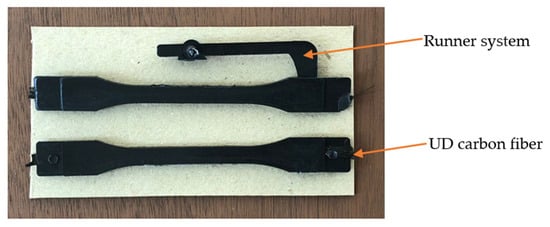 The overmolding process of polypropylene pellets containing short carbon fibers against pre-tensioned unidirectional carbon fibers resulted in a multipurpose specimen, as shown in Figure 6.