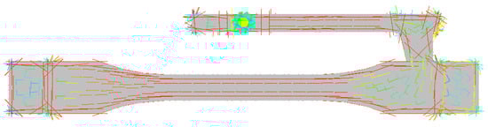 The runner system, especially the gate design, governs the matrix flow that carries the short carbon fibers into the mold. The flow orientation of the matrix can affect the positional stability of the unidirectional carbon fiber. The position of the UD carbon fiber must be ensured to be in the middle of the specimen’s cross section and not shifted due to matrix pressure during overmolding; for this reason, confirmation of gate design using Moldflow simulation was carried out. Figure 7 shows the tensor orientation of the short fibers directed by the flow matrix. Gate design can direct short fibers so that they are oriented parallel to the unidirectional fibers.