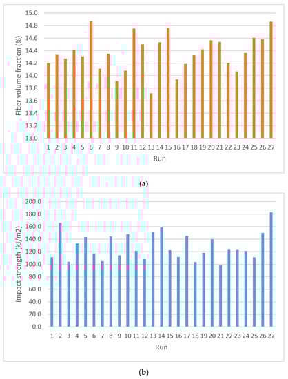 The experimental results in Figure 8 showed that the sixth run with a melting temperature of 210 °C, injection pressure of 120 bar, backpressure of 15 bar, and fiber pretension of 20 N produced the highest volume fraction 14.87%. The highest impact strength of 182.72 kJ/m2 resulted from the 27th run at a combination of melting temperature parameters of 230 °C, injection pressure of 120 bar, backpressure of 10 bar, and fiber pretension of 80 N. The second run with a combination of melt temperature parameters 210 °C, injection pressure 120 bar, backpressure 10 bar, and fiber pretension 50 N can produce the highest flexural strength of 73.32 Mpa after being tested with the four-point bending test. However, further analysis is required to observe the relationship between the four-parameter factors and the three targeted responses. It is essential to obtain factors that significantly affect the response and to obtain the prediction parameters that can produce higher results.