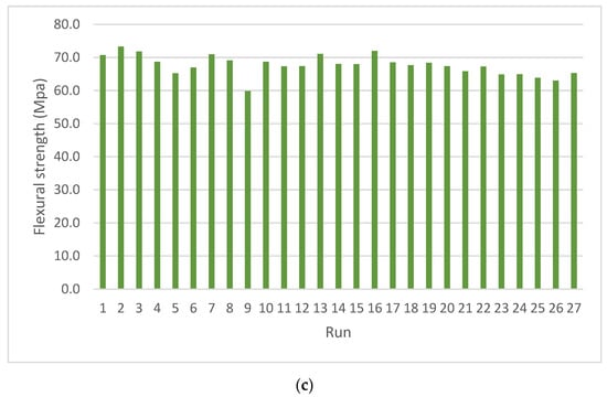 With ANOVA, the relationship between flexural strength and parameter factors can be obtained and expressed mathematically with Equation (6). The equation is in terms of actual factors, and it can be used to make predictions about the flexural strength for given levels of each factor.
