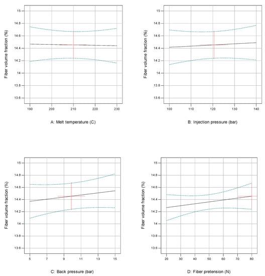 Effect of all factors on fiber volume fraction: (A) melt temperature; (B) injection pressure; (C) backpressure; and (D) fiber pretension.