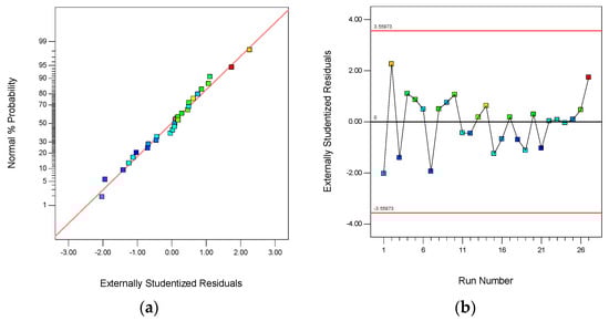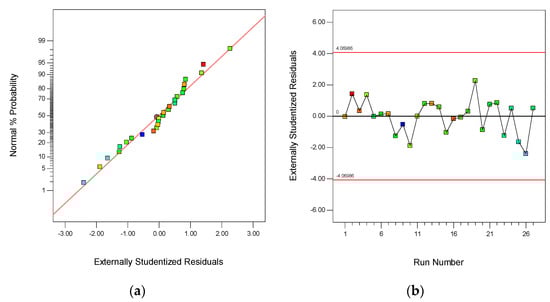 The model’s compatibility with the actual system must be investigated to verify that the model gives an accurate estimate. One of the diagnostic tools that can be used to prove the adequacy of the model is a normal probability plot. Figure 10a displays the normal probability plot of the residuals for the impact strength. As can be seen, the points follow a straight line, so in this case, the residuals follow a normal distribution. The plot of residuals versus the experimental run in Figure 10b shows a random scatter. Residuals in run 1 and run 2 are higher than others but still below the limit, close to the lurking variables that may have influenced the response during the experiment.