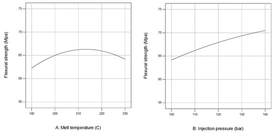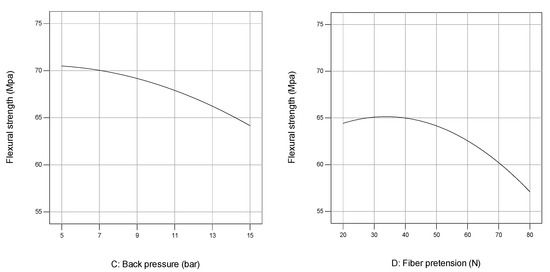 Figure 13 describes the effect of each factor on flexural strength response. It can be observed that the relationship between factors and responses forms a quadratic curve. Considering the influence of each factor individually, the maximum flexural strength value can be achieved at a melt temperature of 215 °C, the injection pressure of 140 bar, backpressure of 5 bar, and fibre pretension of 35 N, respectively. However, if these factors are applied in combination, the model from ANOVA should be used as a reference.