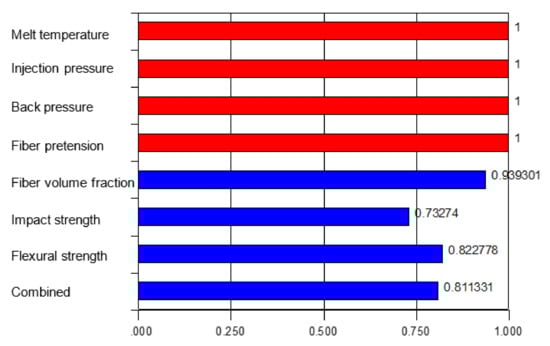 Combined desirability to obtain multiple responses is 0.811 with the following factor combination: melt temperature of 223 °C, the injection pressure of 140 bar, the backpressure of 10.7 bar, and fiber pretension of 65.82 N, respectively. As observed in Figure 15, by applying those parameter combinations, the optimum value can be obtained as follows: fiber volume fraction of 14.45%, impact strength of 143.58 kJ/m2, and flexural strength of 70.67 Mpa below the target value. The selection of parameter combinations depends on the response achieved: individual responses or multiple responses.