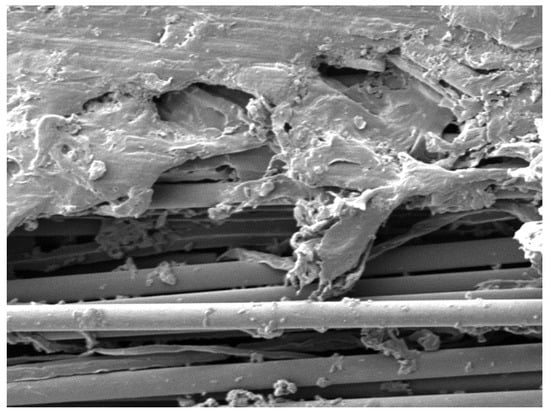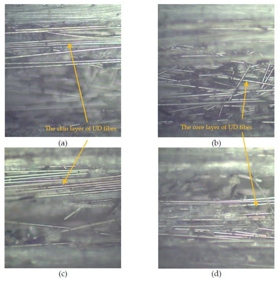 A micrograph of the composite’s longitudinal cross section is shown to determine the difference in morphological conditions of unidirectional fiber with fiber pretension and without pretension treatment when processed in overmold, as shown in Figure 16. In specimens without pretension, injection pressure does not affect the orientation stability of the UD fibers in the skin layer position. The injection pressure induces the matrix to enter mold experience flow resistance on the sidewalls of the mold and pushes the UD fiber from the fiber core, causing fiber misalignment in the core. In the case of UD fibers that experience pretension, the matrix’s pressure towards the center of the UD fiber can be resisted by the stretched fiber; thus, the orientation of the UD fiber can be maintained both in the skin layer and in the core. The condition of fiber pretension is shown in more detail by SEM in Figure 17. The stretching of the fiber also makes it difficult for the PP matrix to penetrate between fiber gaps; some gaps are not filled with the matrix. The short fiber content in the matrix further complicates this condition. Changes in the orientation of the UD fiber affect its contribution in receiving both impact and flexural loads. The result of flexural and impact testing for specimens without pretension treatment on UD fibers are 56 Mpa for flexural strength and 60.03 kJ/m2 for impact strength.