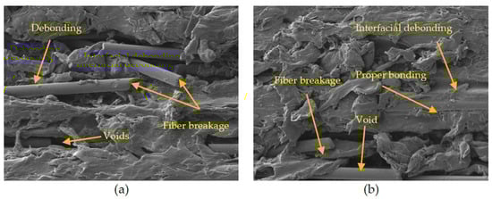 The condition of the longitudinal section undergoing four-point bending test of the specimen with high and low flexural strength values is shown in Figure 18. The scanning electron microscope depicts several modes of damage such as voids, interfacial debonding, and fiber breakage of the fracture surface of the specimen. All bending specimens experienced permanent deformation but did not fracture due to bending, even though the compression stroke had reached more than 20 mm. Figure 18a provides a view of a specimen with low flexural strength; it can be observed that the damage mechanism is dominated by fiber fracture. The initial crack occurs on the compressive side due to fiber breakage, the matrix fails before the UD carbon fiber, and the crack propagates until it reaches the UD fiber, which tends to approach the tensile side, resulting in interfacial debonding. Some voids also appear in the matrix; low melting temperature in combination with high injection pressure can trigger this condition. Voids can occur during the cooling stage due to (1) the difference in cooling rate between the core and the skin of the specimen; (2) inhibition of matrix consolidation by fibres; and (3) fiber displacement. This condition can be overcome by a high melting temperatures injected at low pressure. With these two factors, the temperature difference of the melt can be minimized, and the melt has a better opportunity to penetrate between the fibres. Temperature is the main factor in the viscosity of a molten matrix. Low temperatures increase the viscosity of the melted matrix, and with high injection pressures, it becomes more difficult to penetrate UD fibres [37]. Defects in the matrix can cause stress concentration and reduce the cross section that should withstand the impact. Composites that contain many voids will be more prone to fracture because the voids become crack propagation paths. This flexural strength condition was obtained from confirmation tests on a combination of melting temperature of 190 °C, the injection pressure of 120 bar, backpressure of 10 bar, and fiber pretension of 20 N. The low melting temperature of plastic and fiber pretension contributed to low flexural strengths of the specimen.
