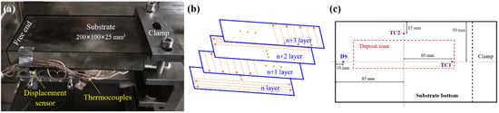 DED process: (a) in situ experimental set-up; (b) scanning path used; (c) locations of two thermocouples (TC1-TC2) and one displacement sensor (DS) at the bottom surface of the substrate.