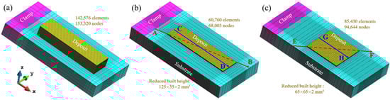 FE mesh models: (a) 40-layer rectangular block; (b) 4-layer rectangular block; (c) 4-layer square block. The lines AB and EF at the build-substrate interface are used to analyze the residual stresses while the lines CD and GH at the deposit top are used to analyze the displacement of DED parts.