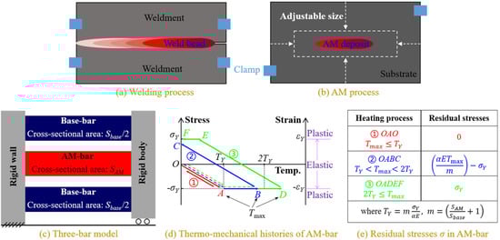 From the viewpoint of the mechanical response, the AM process is similar to welding due to the use of a high energy beam as the input heat in both cases, as shown in Figure 4a,b. In welding, a three-bar model [27] is employed to demonstrate the formation of residual stresses, as shown in Figure 4c. The three bars are one central AM-bar and two lateral base-bars of equal lengths, and their cross-sectional areas are SAM and Sbase/2, respectively. The left end of all three bars is fixed, while the right end is bound with a movable rigid link. For simplicity, the material of the three-bars is assumed to be elastic-perfectly plastic under loading, with a temperature-independent Young’s modulus E, a thermal expansion coefficient , and a yield stress . As thermal straining depends on incremental temperature, the base-bar temperature is set at 0 °C for simplicity. When heating the AM-bar, its thermomechanical response is subjected to the maximum heating temperature Tmax (points A, B, or D), as shown in Figure 4d. Figure 4e lists the residual stresses in the AM-bar for different heating processes; the detailed deduction can be found in reference [27]. Here, is the yield temperature, which is defined as the temperature that causes the material yielding in the AM-bar fixed at both ends either by heating or cooling, and expressed as: