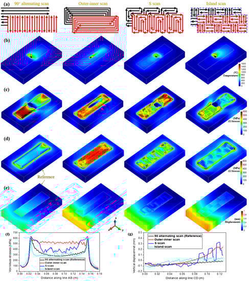 In this section, four different scan patterns are chosen to investigate their effect on the residual stress and distortion: 90° alternating scan, outer-inner scan, island scan, and S scan proposed in [28]; they are shown in Figure 5a.