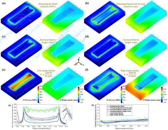 Contour-fills of residual von Mises stresses and the vertical displacements for different AM processes: preheating (a) the whole substrate to 500 °C and (b) the deposit region on the substrate surface by laser (transverse scan); increasing the deposit height to (c) 4 mm and (d) 6 mm, respectively; using the (e) lower and (f) higher energy to fabricate AM block, respectively; (g) residual von Mises stresses along the AB line at the substrate top; (h) vertical displacements along the CD line at the deposit top.